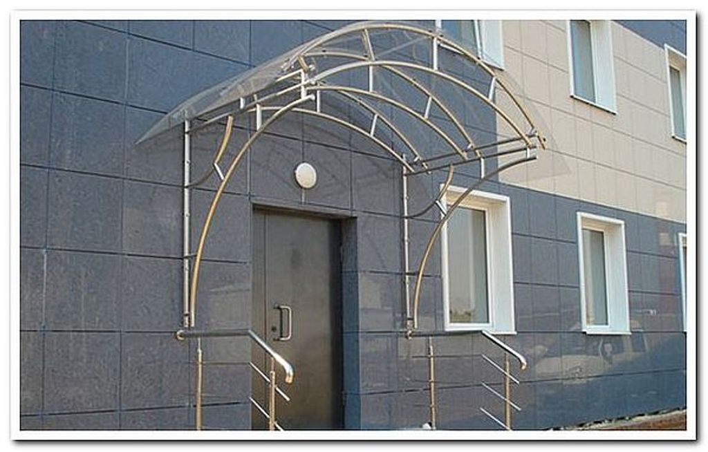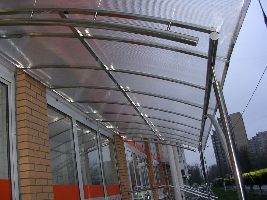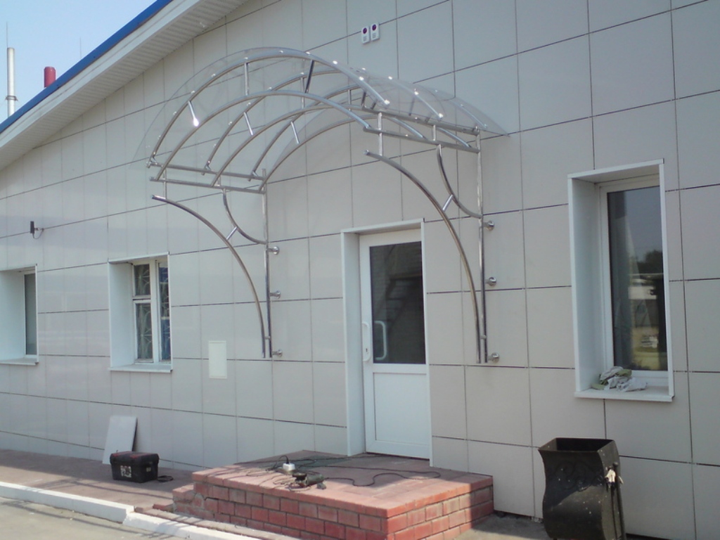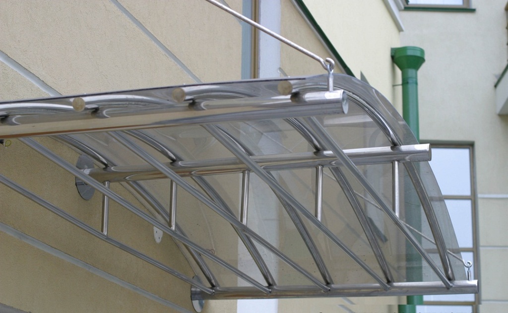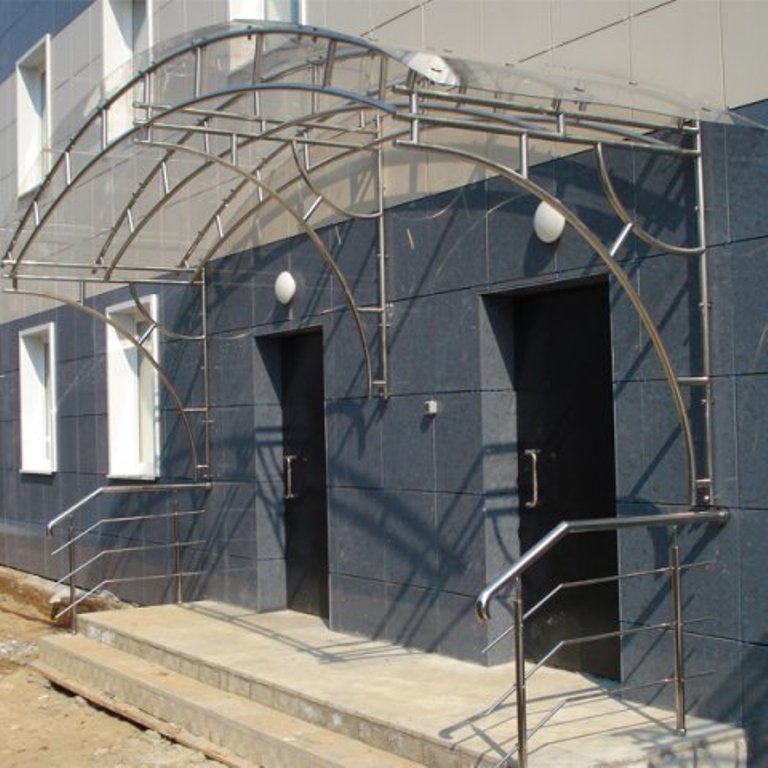 Современный навес из нержавейки можно увидеть повсюду в современном городе: над входами в офисы, банки, магазины. Многие владельцы частных домов тоже устанавливают красивые и что еще важнее – долговечные навесы. Главное преимущество нержавеющей стали – устойчивость к коррозии, в частности, к влаге, что делает ее лучшим материалом для наружных конструкций. Изготавливать навесы из нержавейки сложнее, чем из обычного металла, поэтому кустарным способом сделать красивый навес невозможно, зато умелые мастера с помощью современного оборудования создают великолепные изделия, придающие зданиям вид в стиле «хай-тек».