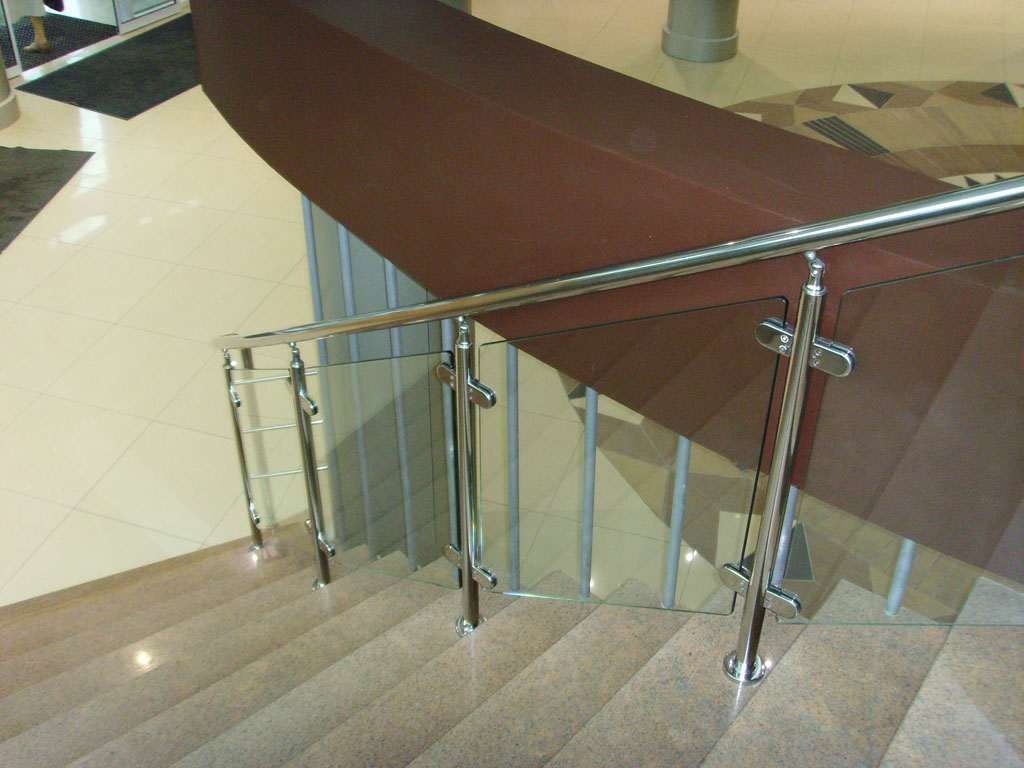 Современные стильные перила со стеклом – отличное решение для оформления любых офисных помещений, торговых залов, павильонов. Стекло играет декоративную роль, отлично оттеняя сами перила из нержавейки или другого материала. Стекло и хром – великолепное сочетание, используемое во всех современных постройках, а «хай-тек» или «минимализм», где повсеместно используется подобное сочетание, – одни из самых модных стилей. Перила со стеклом создают глубину, заполняют все пространство светом, подчеркивают изящество помещений.