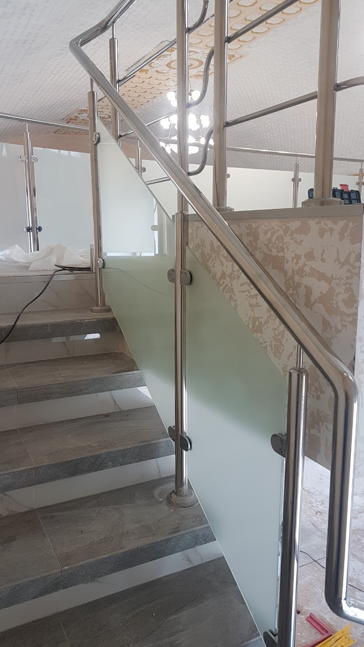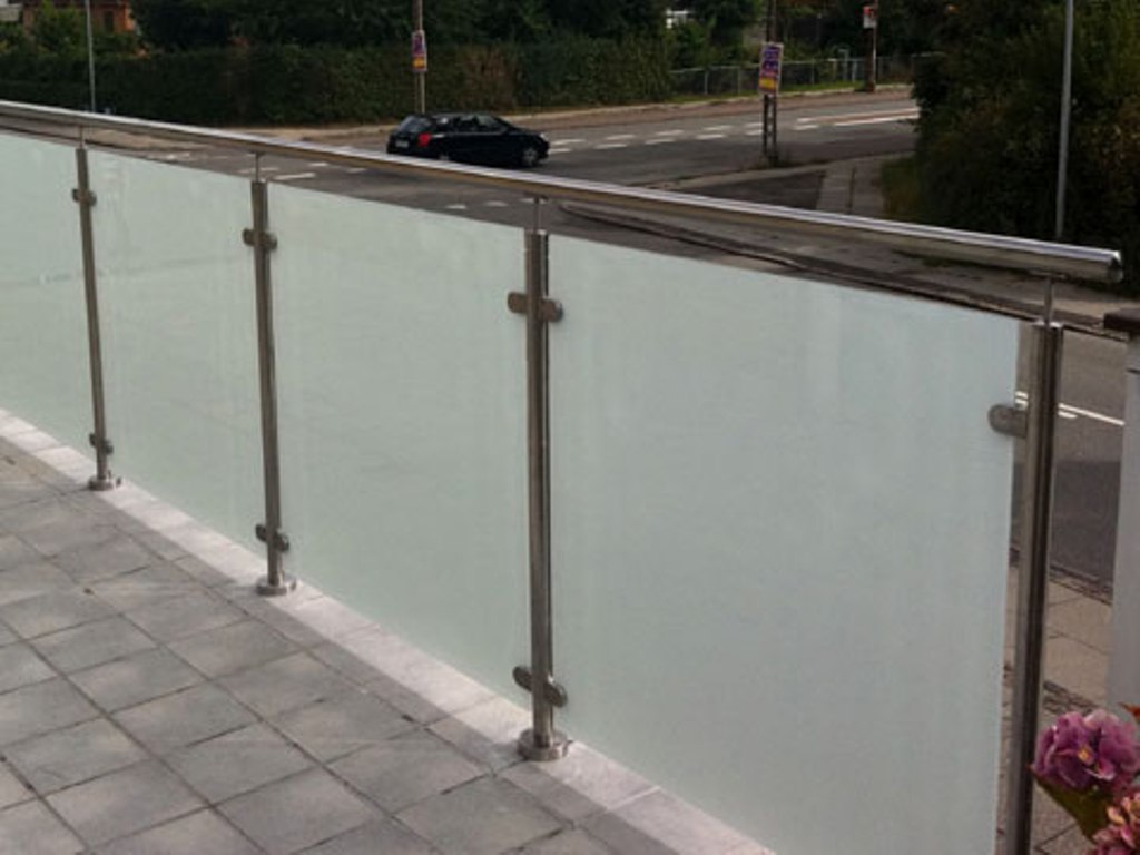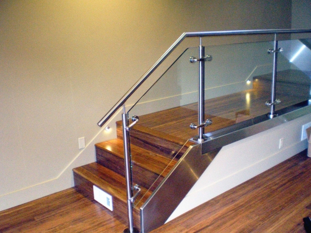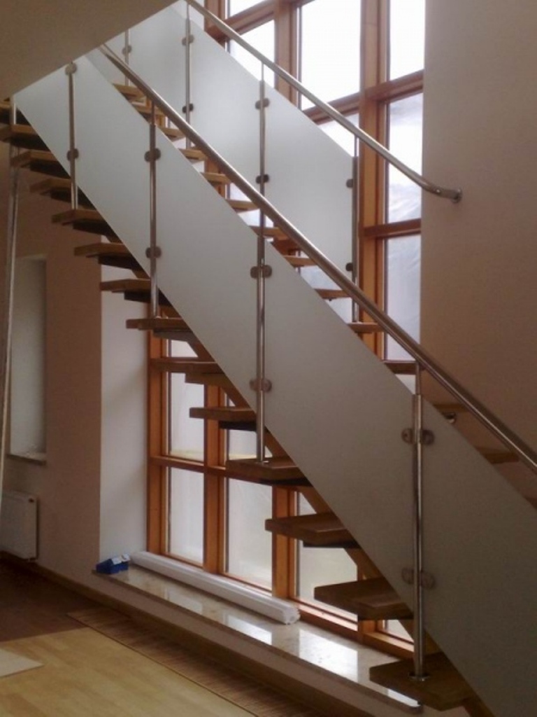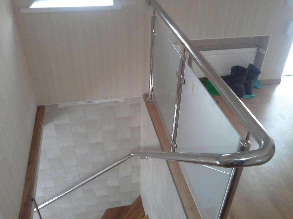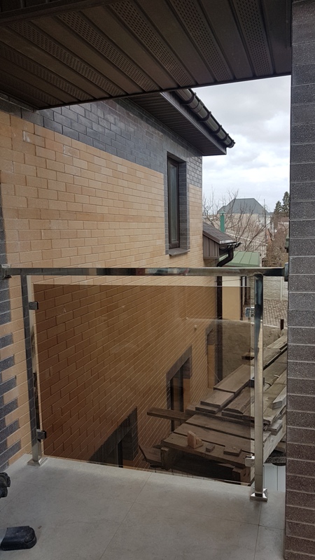 Стекло для перил используется не обычное, а каленое либо триплекс. Каленое стекло намного прочнее обычного, из него также делают столы, свободно выдерживающие вес взрослого человека, двери в торговых центрах. Триплекс тоже безопасен, ведь несколько стекол, проклеенных пленкой, не бьются, а лишь покрываются трещинами.